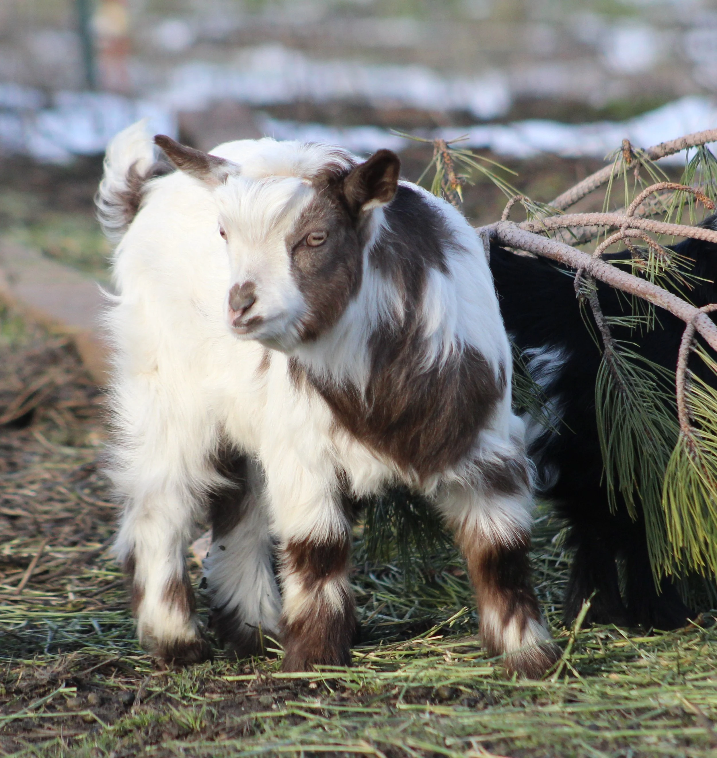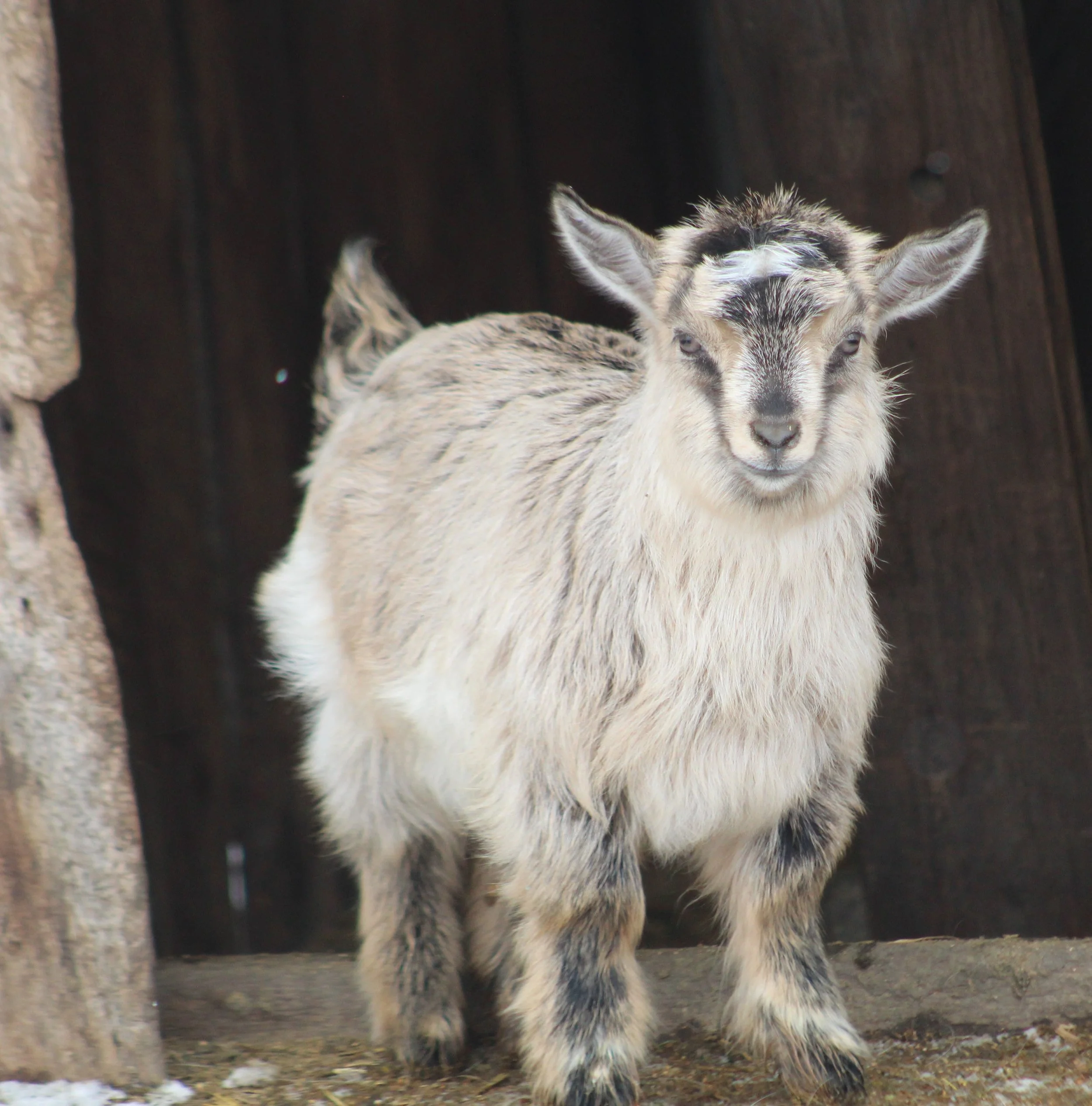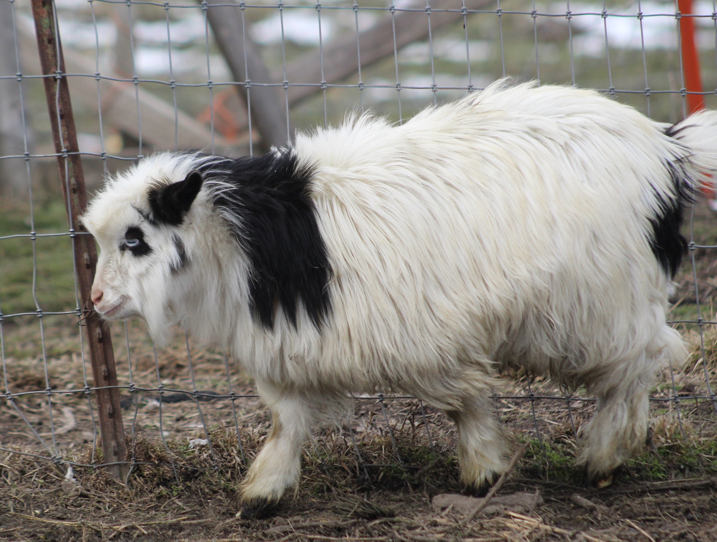 Ari was born Feb. 4, 2025 and is growing out beautifully. She would make a wonderful pet, brood doe, or possibly a show goat if her facial hair comes in more. She may grow out her coat a little slower due to her coloring, but she will be stunning when it comes in!